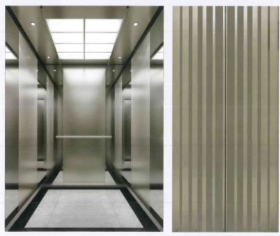 轎壁:三側轎壁均為中間香檳金噴砂兩側香檳金鏡面不銹鋼,底部鏡面不銹鋼腳線